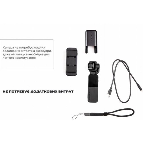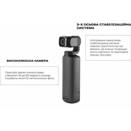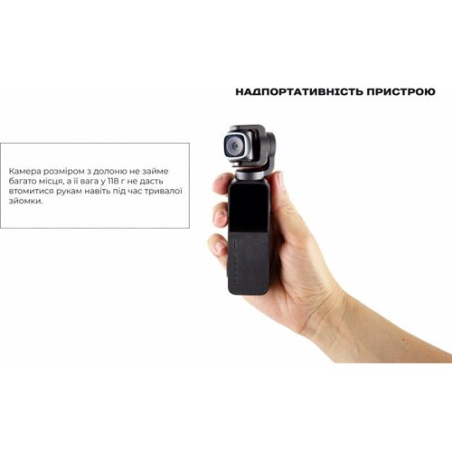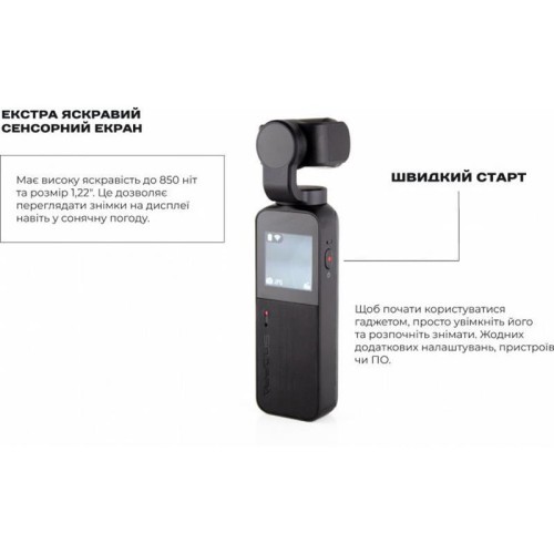 | Інше | Ультракомпактний стедикам з камерою. Комплектація: Ремінець на руку, Двокомпонентний жорсткий чохол, Кабель для зарядки і підключення до комп'ютера, Захисна плівка на екран і об'єктив |