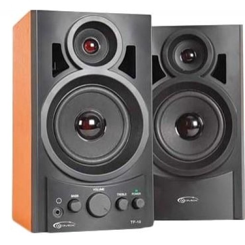 Gemix TF-10 - проста і надійна акустична система. Якісний корпус з дерева і продуманий дизайн надає колонкам більш дорогий зовнішній вигляд і робить їх повноцінним елементом інтер'єру робочого столу. На передній панелі Gemix TF-10 розмістився радий регуляторів, що відкриває швидкий доступ до налаштування основних параметрів. Звук відтворюється чисто і без спотворень з досить глибокими басами, що робить його універсальним базовим рішенням для музики, ігор і фільмів. Також Gemix TF-10 оснащується 3,5 мм аудіороз'ємом для прямого підключення навушників.