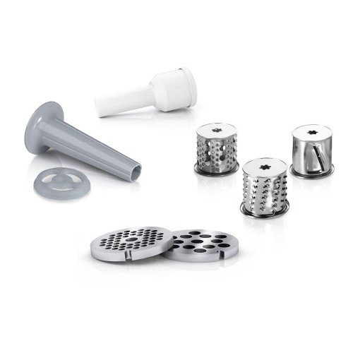 Багатофункціональна електром'ясорубка Bosch MFW2514W дозволить швидко і якісно приготувати фарш з різних продуктів, а також нашаткувати або натерти овочі і фрукти. Прилад виготовлений в пластиковому корпусі і обладнаний одношвидкісним двигуном максимальною потужністю 1500 Вт, що працює з продуктивністю 1,7 кг за хвилину. Дві решітки з діаметром отворів 3,8 і 8 мм, що виготовлені з високоякісної нержавіючої сталі, служать для виготовлення фаршу різної консистенції. Три металевих барабани овочерізки дозволять швидко і безпечно натерти овочі, сир, горіхи та інші необхідні інгредієнти для приготування їжі, а спеціальна конусоподібна насадка призначена для швидкого формування домашніх ковбасок. Електром'ясорубка Bosch MFW2514W укомплектована пластиковим лотком з штовхачем і встановлена на гумові ніжки, які не ковзають, що забезпечують стійкість під час роботи.