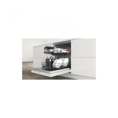 Посудомийна машина Whirlpool WI 3010 виготовлена у варіанті, що повністю вбудовується в кухонні меблі, в білому кольорі. За новим маркуванням, прийнятим у Євросоюзі з 1 березня 2021 року, вона відповідає класу енергоспоживання F. Містка та багатофункціональна модель розрахована на максимальне завантаження 13 комплектів посуду, для очищення якого витрачається 12 літрів води. Система корзин FlexiSpase дозволяє розміщувати в робочій камері пристрою, виготовленої з нержавіючої сталі, кухонне начиння різного розміру та з різних матеріалів. Для цього є знімні спеціальні підставки та знімний верхній короб, що звільняє достатньо місця, у тому числі і для нестандартного посуду великих габаритів. Прилад здатний функціонувати в спеціальних режимах: інтенсивному для миття сильних забруднень і експрес, щоб максимально прискорити процес. Посудомийна машина Whirlpool WI 3010 має таймер і управляється електронною панеллю з цифровим дисплеєм.