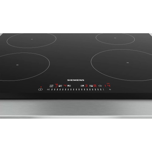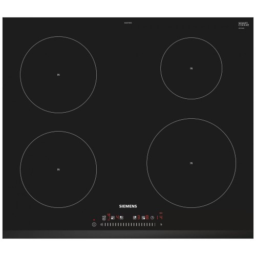 Електрична варильна поверхня Siemens EU631FEB1E розроблена з індукційними нагрівальними елементами в стильному сучасному дизайні. На її склокераміки суворого чорного кольору знаходяться 4 конфорки різного розміру і потужності. Всі вони обладнані індикатором залишкового тепла і мають функції розпізнавання наявності посуду і прискореного розігріву PowerBoost. Температура зручно регулюється сенсорною панеллю TouchSlider як дотиком, так і проводячи пальцем по плоскій шкалою. Час приготування страв може здаватися для кожної зони нагріву таймером з відключенням або зі звуковим сигналом (без відключення). Крім того, завдяки Cleaning-паузи можна заблокувати панель керування до 30 секунд. Безпека використання електричної варильної поверхні Siemens EU631FEB1E забезпечується системою захисного відключення.