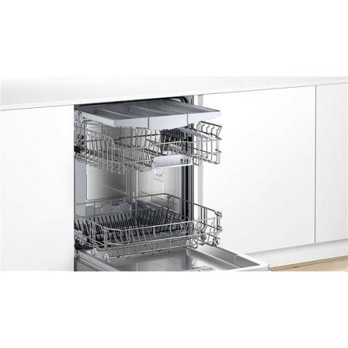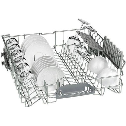 Посудомийна машина Bosch SMV25EX00E виготовляється в білому кольорі і повністю вбудовується в кухонні меблі. Модель класу енергоспоживання А+ розрахована на максимальне разове очищення 13 комплектів посуду. У ній застосований економічний бесщіточний двигун EcoSilenceDrive, що функціонує з низьким рівнем шуму - до 48 дБ. Верхня корзина приладу оснащена механізмом Rackmatic, за допомогою якого навіть в завантаженому стані регулюється по висоті трьома рівнями, дозволяючи розміщувати габаритні каструлі і сковорідки. Пристрій дбайливо і делікатно вимиє і висушить скляні і крихкі вироби. Технологія ActiveWater за рахунок продуманих конструкторських рішень забезпечує оптимальне споживання ресурсів при високій ефективності роботи. Виконання програми супроводжується світловим променем на підлозі, а після її завершення лунає звуковий сигнал. Управляється посудомийна машина Bosch SMV25EX00E інтуїтивно зрозумілими електронними кнопками.