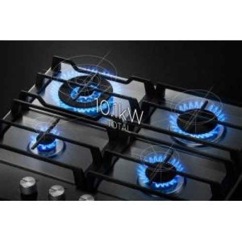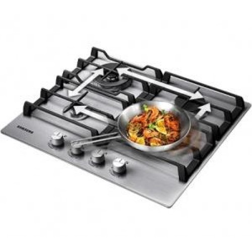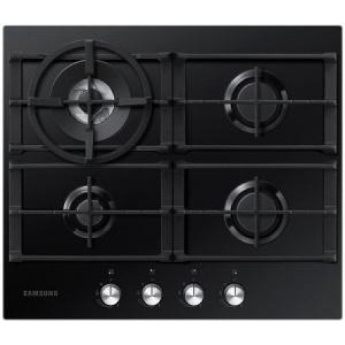 Варильна поверхня газова Samsung NA64H3030AK / WT випускається в сучасному дизайні в практичному і строгому чорному кольорі. Вона покрита загартованим склом і містить 4 конфорки різного розміру і потужності. Крім економічної і двох середніх пальників, в моделі є WOK-конфорка потужністю 3,8 кВт з трьома рядами полум'я. Остання конфорка служить для швидкого приготування їжі в габаритних каструлях і сковорідках, а також для готування страв азіатської кухні. Всі пальники оснащені функцією електричного підпалювання і обладнані захисною системою газ-контролю. Щоб розміщувати посуд, над конфорками встановлена стильна чавунна решітка, що володіє міцністю і стійкістю. По ній можна безпечно переміщати каструлі і сковорідки, не піднімаючи їх, а для особливої WOK-посуду в комплект поставки входить додаткова спеціальна решітка. Управляється газова варильна поверхня Samsung NA64H3030AK / WT ергономічними поворотними перемикачами на передній панелі.